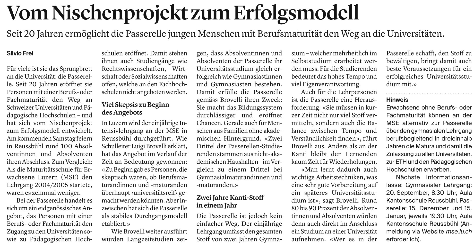 - Bericht von Silvio Frei (Absolvent Passerelle 2015) in der Luzerner Zeitung vom 28. August 2025: „Vom Nischenprojekt zum Erfolgsmodell“