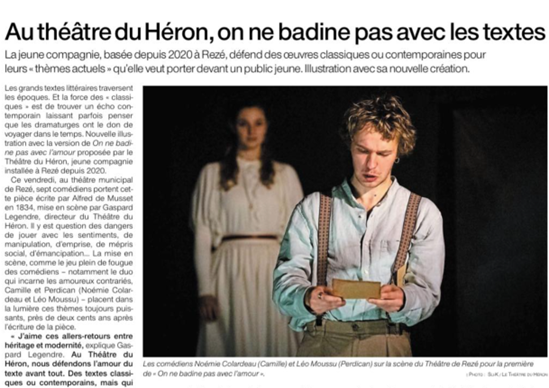 Néanmoins, ce que je garde pour le temps à venir, c’est l’histoire d’amour entre Perdican et Camille. Je comprends très bien Camille et sa peur de souffrir à cause de l’amour. Cependant, Perdican a dit des mots très profonds. Il a dit qu’à la fin de sa vie, il veut pouvoir dire que oui, il a souffert, mais que – et c’est la seule chose importante – qu’il a aimé. Et c’est ça que je garde en tête. Je suis reconnaissante que nous ayons eu la possibilité de lire cette histoire. »